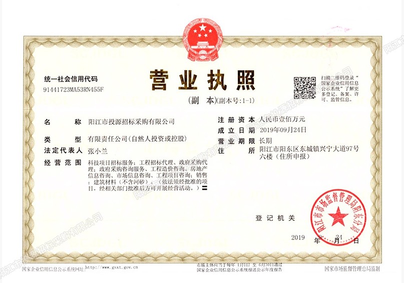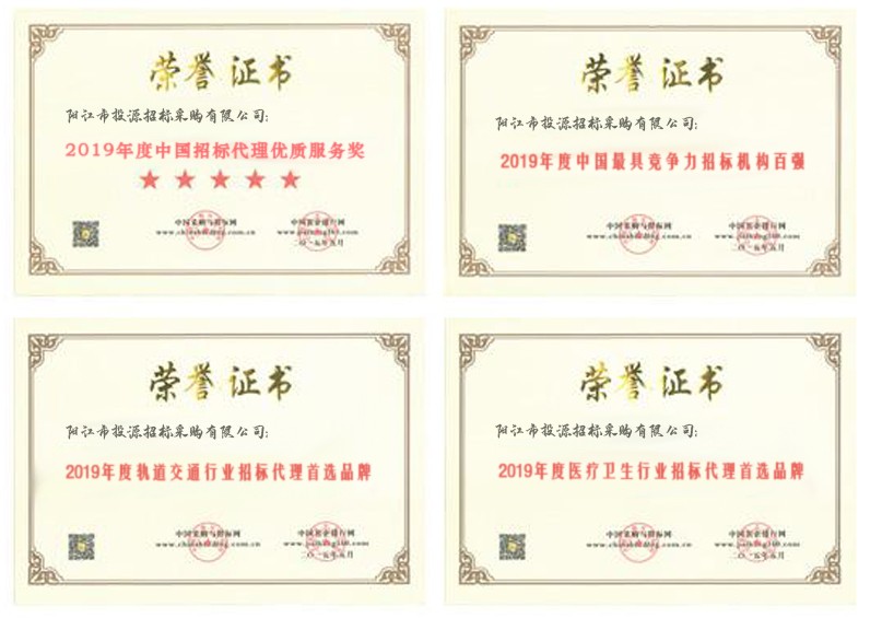 陽江市投源招標(biāo)采購有限公司是經(jīng)國家和陽江市政府有關(guān)部門批準(zhǔn),于2019年9月成立,依法從事招標(biāo)代理業(yè)務(wù)的專業(yè)機(jī)構(gòu)。被國家和省市行政主管部門授予的專業(yè)資質(zhì)有:中國政府采購代理機(jī)構(gòu)及廣東省政府采購代理機(jī)構(gòu)資格、國際招標(biāo)、建設(shè)工程招標(biāo)代理資格、藥品和醫(yī)療器械招標(biāo)代理資格等。